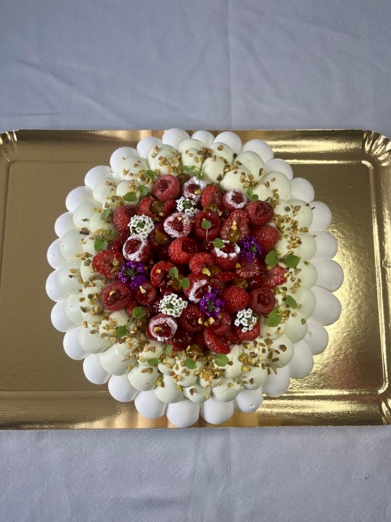 Cette pavlova vous offre un moment de légèreté pour finir votre repas festif. Retrouvez ses framboises fraîches, sa crème onctueuse à la pistache et sa meringue craquante à l’extérieur et moelleuse à l’intérieur.
