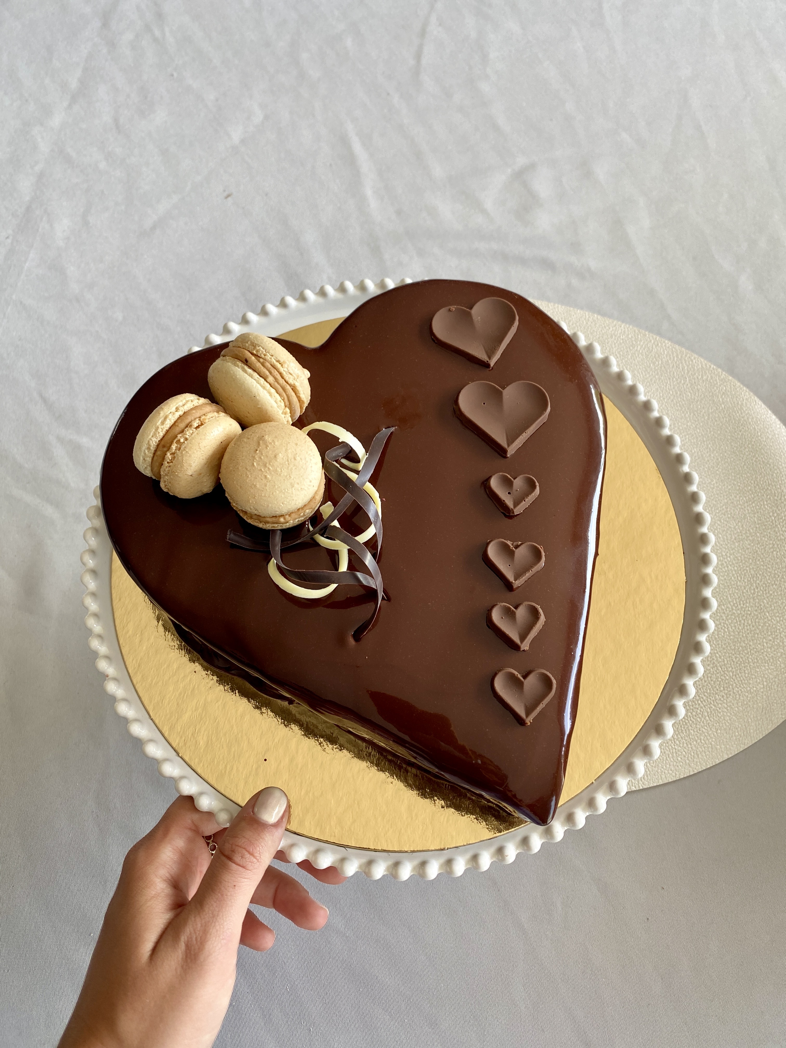Un cœur gourmand composé de fines crêpes dentelles croustillantes, d’un biscuit Joconde moelleux et d’une mousse bavaroise onctueuse à la fraise ou au chocolat noir, le tout enrobé de chocolat noir ou blanc.